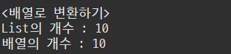 - 리스트 안의 데이터를 배열로 변환해서 반환한다.