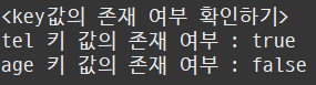 System.out.println("tel 키 값의 존재 여부 : " + map.containsKey("tel"));