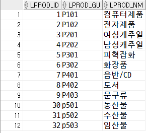 INSERT INTO LPROD(LPROD_ID,LPROD_GU,LPROD_NM)