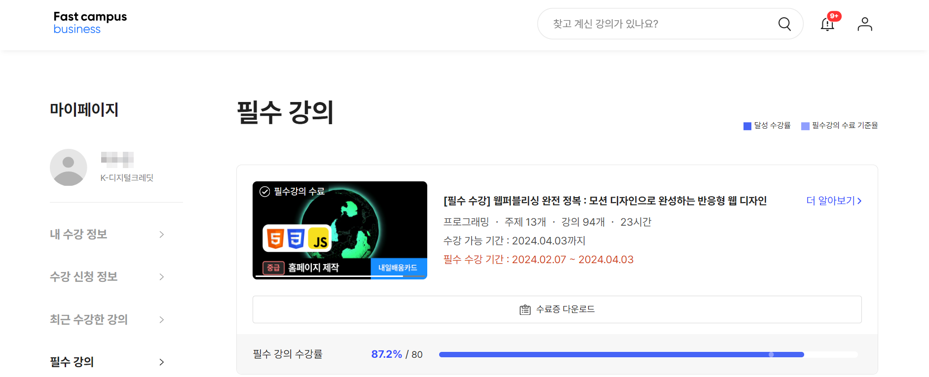 좀 더 집중력 있는 학습을 원하신다면 한 개의 과정을 수료한 후에 다음 과정을 수강하는 것을 추천합니다.