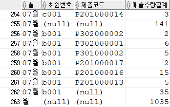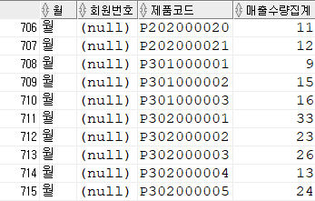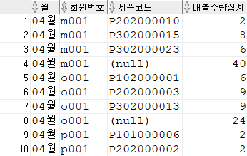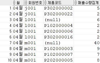 사용예) 장바구니 테이블에서 2020년 월별,회원별,제품별,매출수량집계를 구하시오.