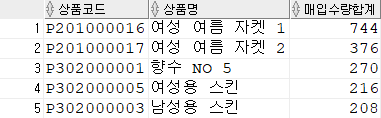 (메인쿼리 : 상위 5개 상품의 상품코드,상품명,매입수량합계)