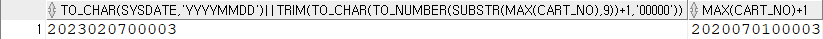 TRIM(TO_CHAR(TO_NUMBER(SUBSTR(MAX(CART_NO),9))+1,'00000')),
