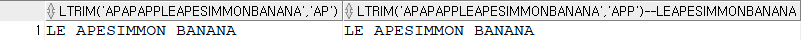 SELECT LTRIM('APAPAPPLE APESIMMON BANANA', 'AP'),-- LE APESIMMON BANANA