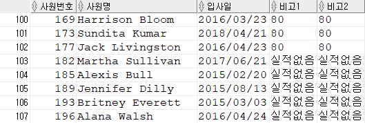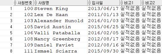 사용예) 사원테이블에서 영업실적이 NULL이면 '영업실적없음'을, 영업실적이 있으면 영업실적을 비고난에 출력하시오.