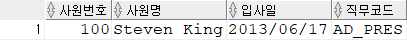 ** 사원명 'Steven King' 사원의 사원번호,사원명,입사일,직무코드를 조회