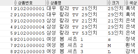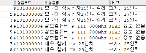 사용예) 상품테이블에서 다음 자료를 주어진 조건에 맞추어 출력하시오
