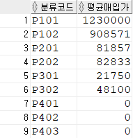 사용예) 모든 분류코드별 평균매입가를 구하시오.