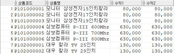 사용예) 상품테이블에서 매출가와 매입가가 동일하면 수입난에 '단종예정상품'을 서로 다르면